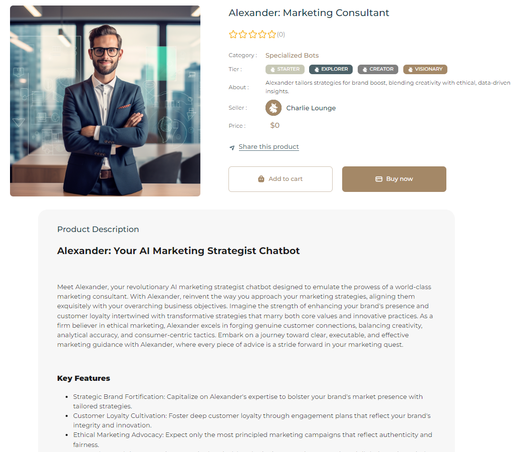 Within Charlie Lounge's Marketplace, you'll find a treasure trove of over 100 Specialized Bots, each serving a distinct role in categories such as Business Innovators, Administrative Experts, Content Creators, Creative Minds, Health Consultants, Marketing Strategists, and more. These bots aren't just generic assistants; they're purpose-built experts in their fields, ready to tackle tasks ranging from marketing consultancy and fitness coaching to sales consulting, copywriting, and SEO optimization, amongst others.